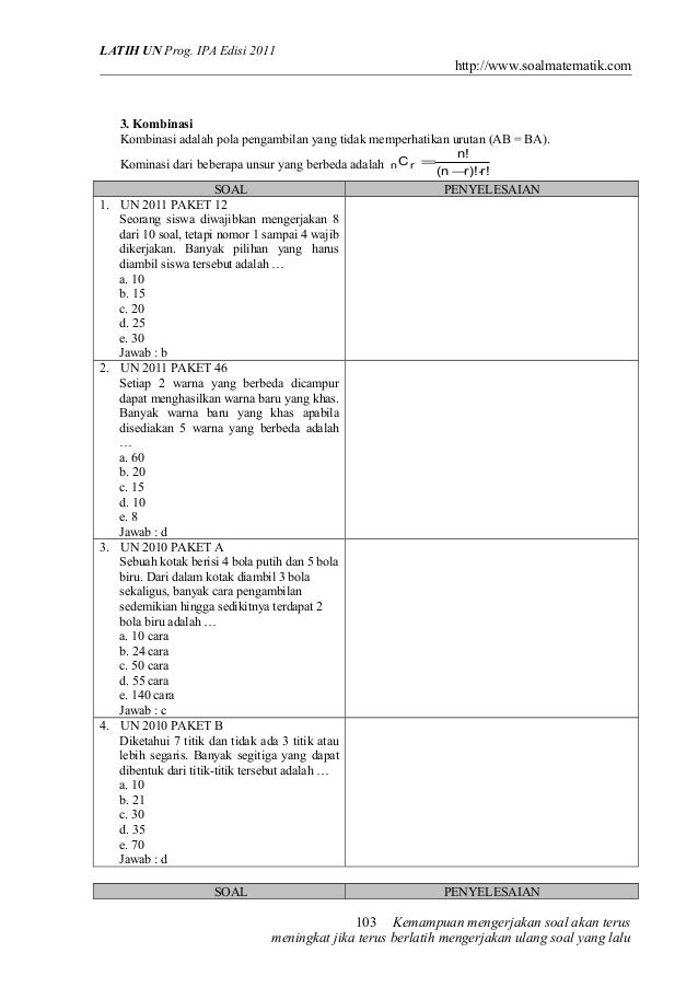 Prediksi soal un dan unbk bahasa indonesia smk. Banyak cara pengambilan 3 kelereng putih dari kantong tersebut adalah… Banyak garis yang dapat dibuat dari 8 titik yang tersedia, dengan tidak ada 3 titik yang segaris adalah …. Soal di atas kita jawab dengan menggunakan kombinasi. (un 2017/ipa) seorang programer akan membuat kode sandi berupa string yang terdiri dari 6 angka.