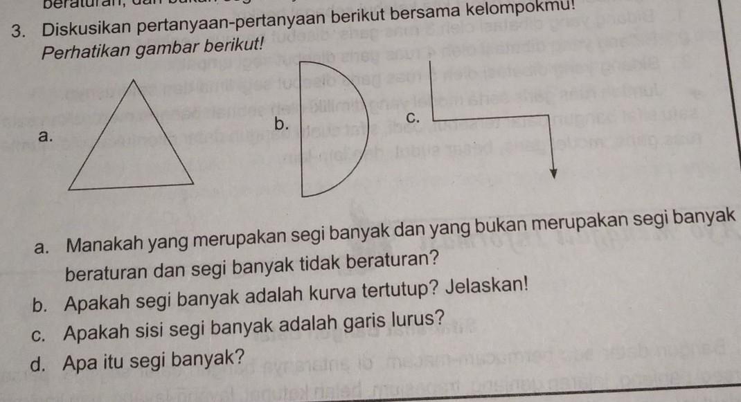 Memilliki banyak sisi dan titik sudut. Contoh segi banyak, antara lain: Yaitu mengenai segi banyak, lingkaran, dan tangram. Apakah sisi segi banyak adalah garis lurus?jelaskan!tolong di jawab plis . Bidang kita dapat menggambar model suatu garis lurus dan memberi nama. Segi banyak adalah sebuah bangun datar tertutup yang seluruh sisinya dibatasi dengan garis. Bukan sebuah garis lurus tetapi semuanya sisi terdiri dari garis lurus, paling sedikit terdiri dari 3 sisi garis . Berikut yang bukan bangun segi banyak tidak beraturan adalah. Karena segi banyak terbentuk dari tiga atau lebih sisi yang merupakan garis lurus. Jumlah sudut yang ada sama banyak dengan jumlah sisi . Sisi segi banyak berupa garis lurus. Sisi segi banyak adalah garis lurus d. Ya, sisi segi banyak harus merupakan garis lurus.